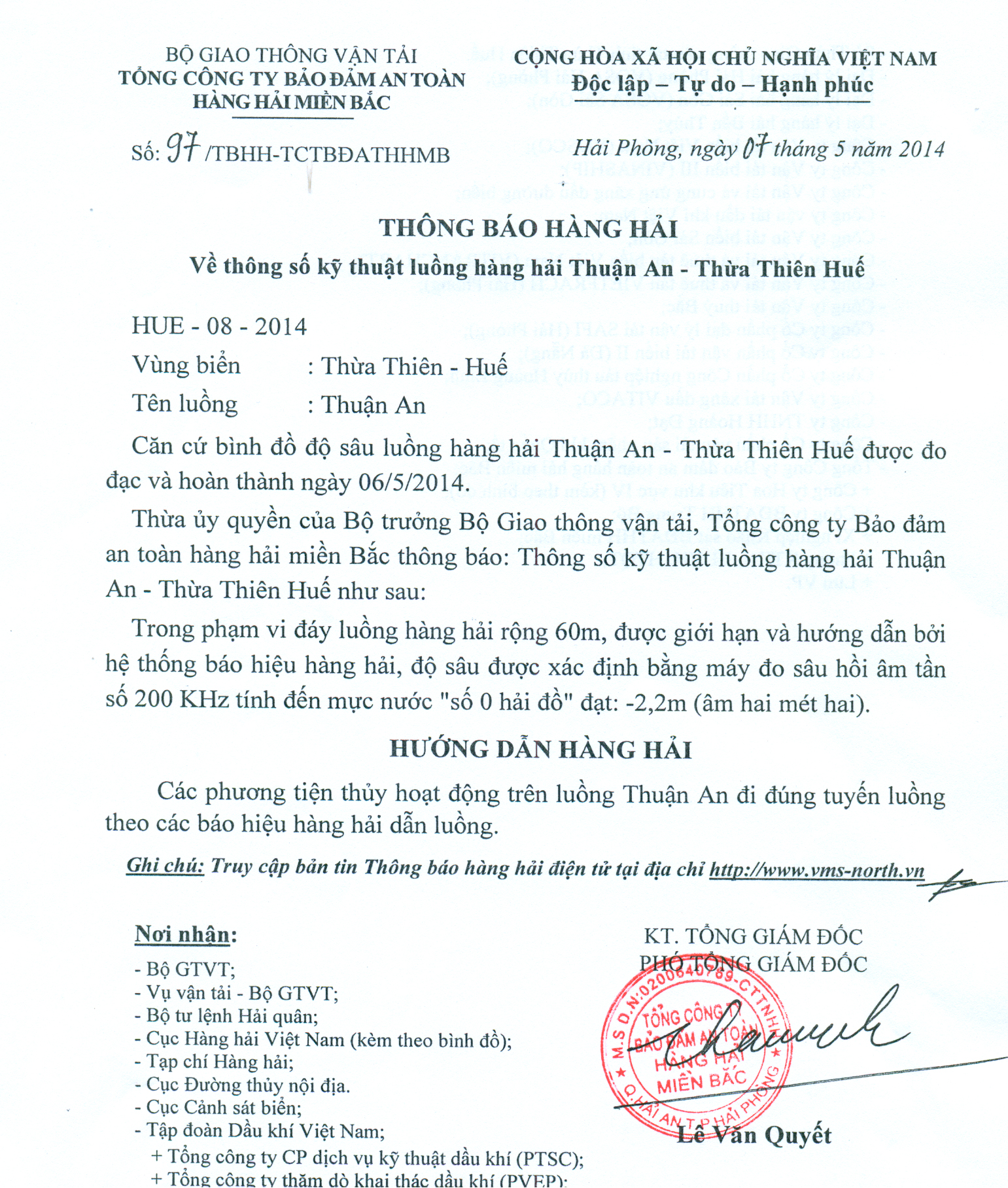 Thừa ủy quyền của Bộ trưởng Bộ Giao thông vận tải, Tổng công ty Bảo đảm an toàn hàng hải miền Bắc thông báo: Thông số kỹ thuật luồng hàng hải Thuận An - Thừa Thiên Huế như sau: