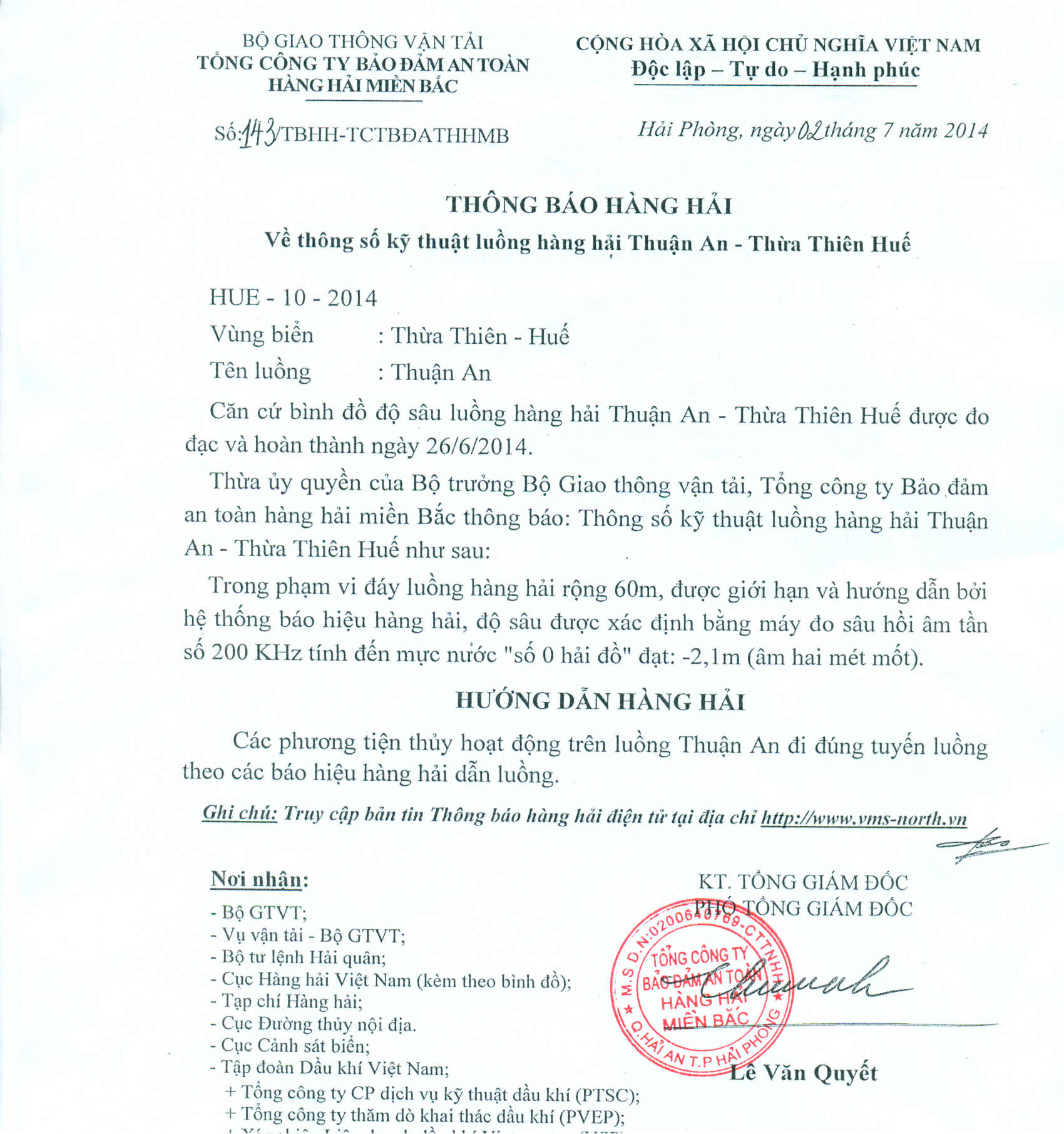 Thừa ủy quyền của Bộ trưởng Bộ Giao thông vận tải, Tổng công ty Bảo đảm an toàn hàng hải miền Bắc thông báo: Thông số kỹ thuật luồng hàng hải Thuận An - Thừa Thiên Huế như sau: