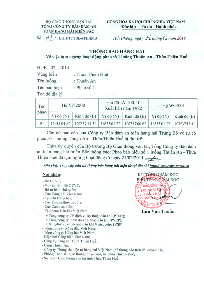 Thừa ủy quyền của Bộ trưởng Bộ Giao thông vận tải, Tổng công ty Bảo đảm an toàn hàng hải miền Bắc thông báo: Phao báo hiệu số 1 luồng Thuận An - Thừa Thiên Huế đã tạm ngừng hoạt động từ ngày 21/02/2014.