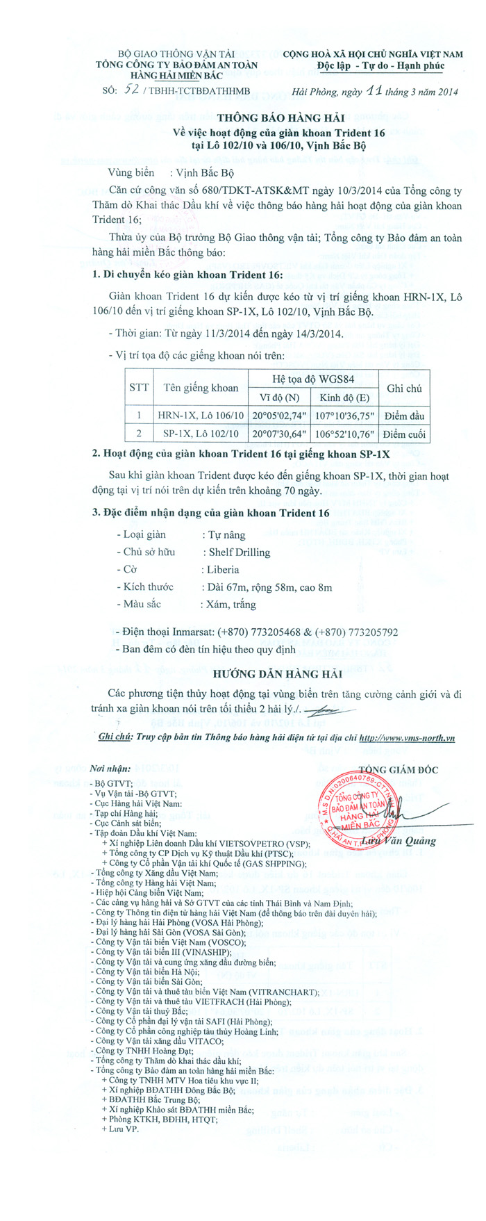 Căn cứ công văn số 680/TDKT-ATSK&MT ngày 10/3/2014 của Tổng công ty Thăm dò Khai thác Dầu khí về việc thông báo hàng hải hoạt động của giàn khoan Trident 16;