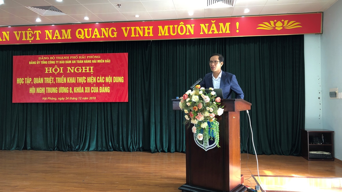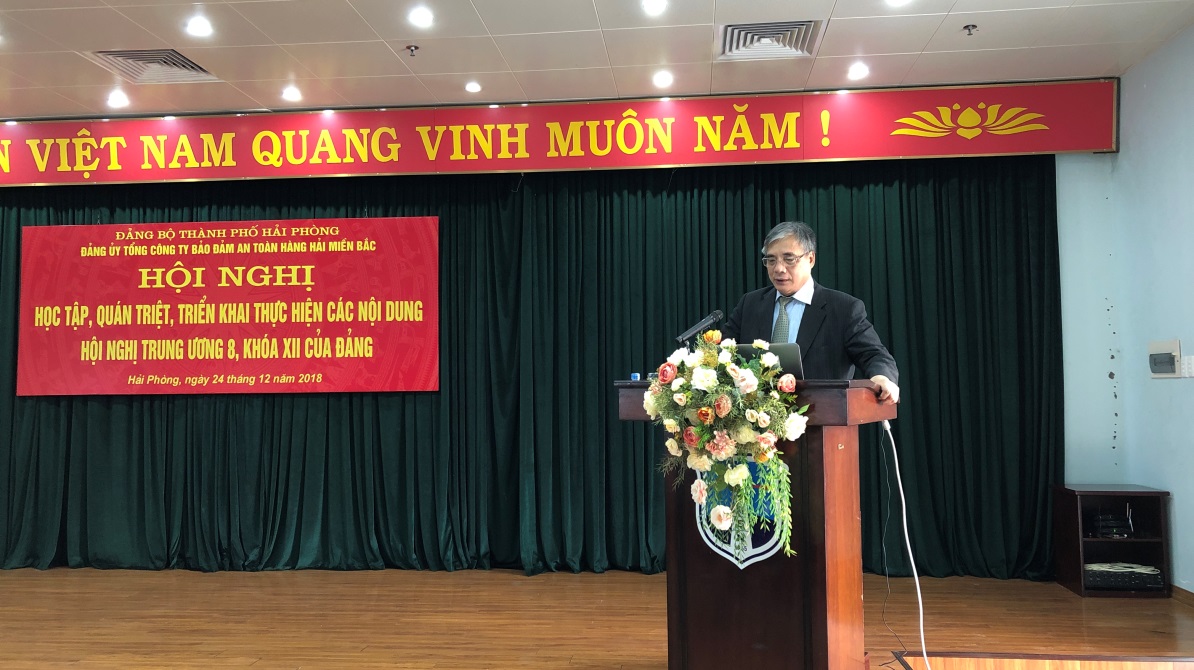 Sáng ngày 24/12/2018, Đảng ủy Tổng công ty Bảo đảm an toàn hàng hải miền Bắc đã tổ chức Hội nghị Học tập, quán triệt, triển khai thực hiện các nội dung Hội nghị Trung ương 8, khóa XII của Đảng. Đến dự có Phó Giáo sư, Tiến sĩ Trần Đình Thiên – Viện Trưởng Viện Kinh tế Việt Nam, Chủ tịch Hội đồng Khoa học Viện Kinh tế Việt Nam; đồng chí Phạm Quốc Súy – Bí thư Đảng ủy, Chủ tịch Hội đồng thành viên; đồng chí Đồng Trung Kiên – Tổng Giám đốc; đồng chí Lê Mạnh Toàn – Phó Bí thư Thường trực Đảng ủy và các đồng chí đảng viên hiện đang công tác tại Tổng công ty khu vực Hải Phòng.