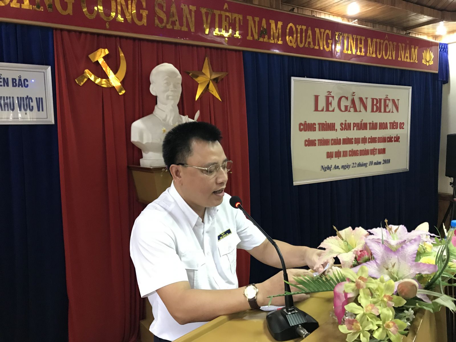 Chiều ngày 22/10/2018, tại Thành phố Vinh (Nghệ An), Công đoàn Giao thông vận tải (GTVT) Việt Nam tổ chức Lễ gắn biển Công trình, sản phẩm thi đua chào mừng Đại hội Công đoàn các cấp, Đại hội XII Công đoàn Việt Nam của Công đoàn Công ty Hoa tiêu hàng hải khu vực VI thuộc Công đoàn Tổng công ty Bảo đảm an toàn hàng hải (BĐATHH) miền Bắc. Đến dự buổi Lễ có đồng chí Phạm Hoài Phương - Phó chủ tịch Công đoàn GTVT Việt Nam; đồng chí Nguyễn Quốc Thế - Phó Ban Tuyên giáo Công đoàn GTVT Việt Nam; về phía Tổng công ty BĐATHH miền Bắc có đồng chí Nguyễn Trọng Vinh - Thành viên Hội đồng thành viên, Chủ tịch Công đoàn Tổng công ty; đồng chí Dương Ngọc Đức - Phó Tổng Giám đốc, Phó Chủ tịch Công đoàn Tổng công ty; đồng chí Đào Mạnh Hà - Bí thư Chi bộ, Giám đốc Công ty TNHH MTV Hoa tiêu khu vực VI; cùng các đồng chí đại diện Ban Thường vụ Công đoàn Tổng công ty, Ban lãnh đạo chuyên môn, Công đoàn Công ty TNHH MTV Hoa tiêu khu vực VI và cán bộ, đoàn viên, người lao động công ty.