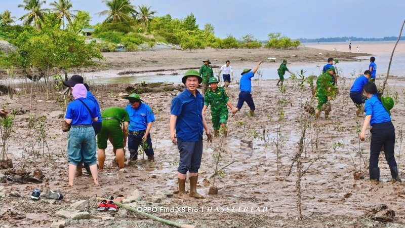 Tại khu vực xã Long Vĩnh, tỉnh Vĩnh Long, các đoàn viên thanh niên đã tổ chức trồng khoảng 1.000 cây bần dọc theo bờ phải tuyến luồng hàng hải cho tàu biển trọng tải lớn vào Sông Hậu.